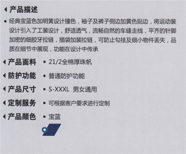 經典寶藍色加明黃設計撞色,袖子及褲子側邊加黃色貼邊,將運動裝設計引入了工裝設計,舒適透氣,流暢自然的車縫走線,平齊的針腳加密的細膠牙拉鏈,插袋加裝拉鏈,可防止勾掛及細小物件丟失,品質在細節中展現,功能在設計中傳承